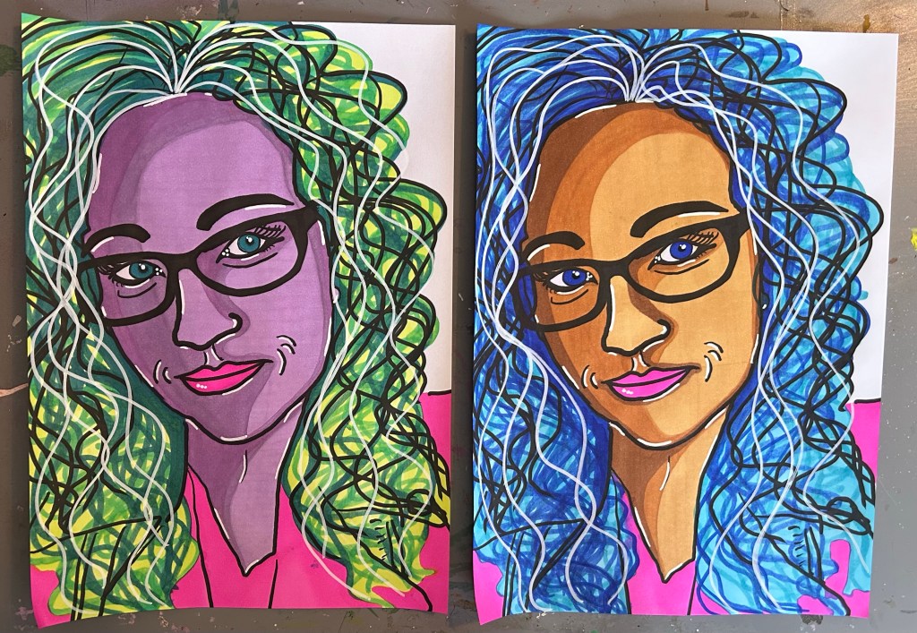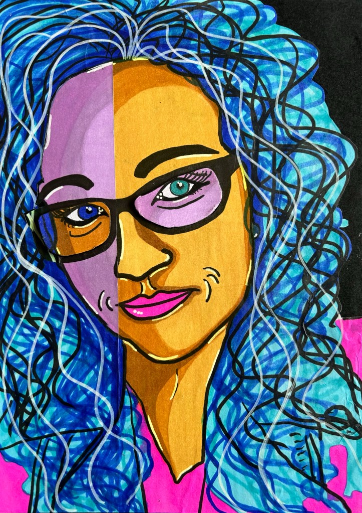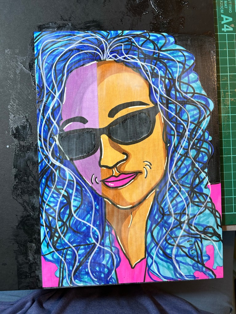 I’ve just finished my first course #50funfabfairies so felt confident enough to use alcohol markers. I outlined my face, made two copies, coloured with markers, I then cut out and swapped pieces on each face to create a collage, before finishing with my signature dots..